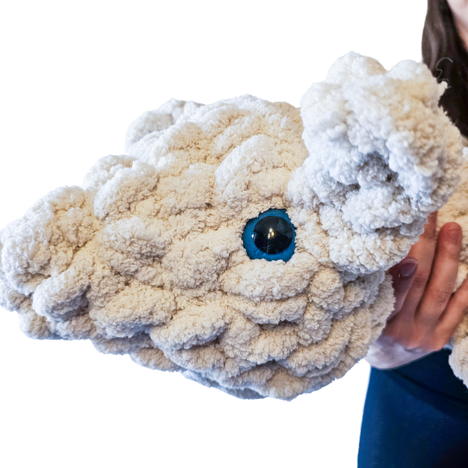 Przytulanka jest zrobiona z mięciutkiej pluszowej włóczki. Posiada zamontowane bezpieczne oczka.